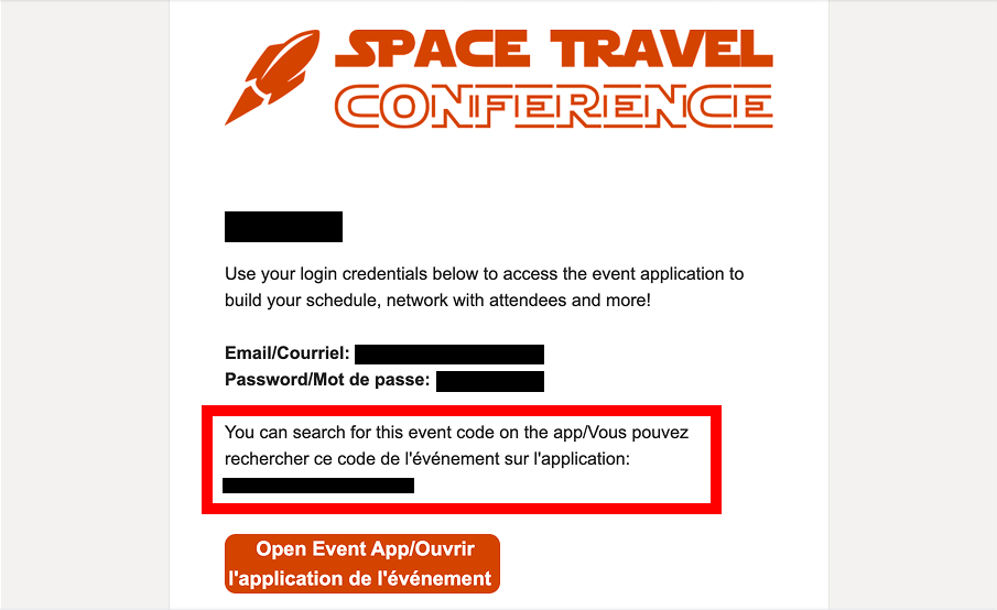 An email will now be sent to the attendee(s), inviting them to the mobile app. This email also contains the event code which they can use to search for the event.