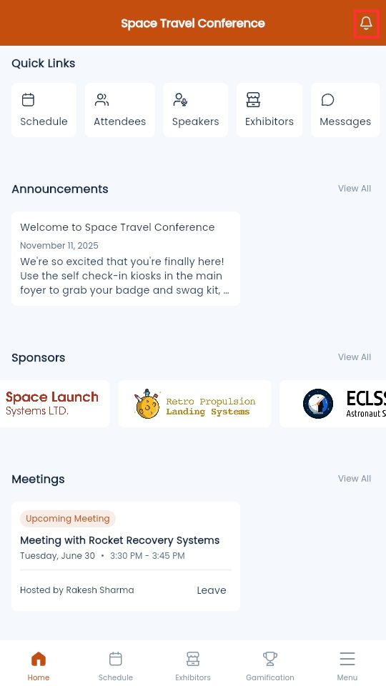 From the Event Homepage, navigate to the bell icon on the top right corner of the page.