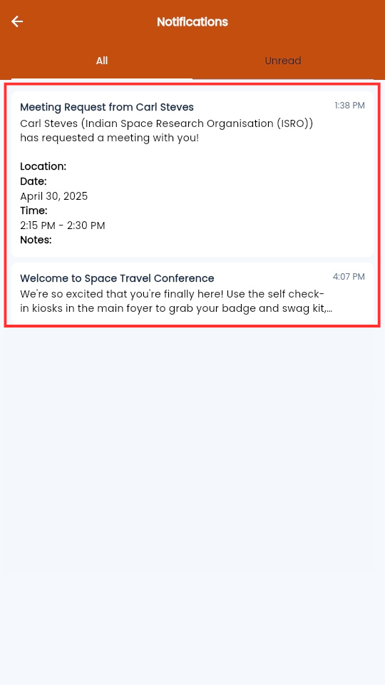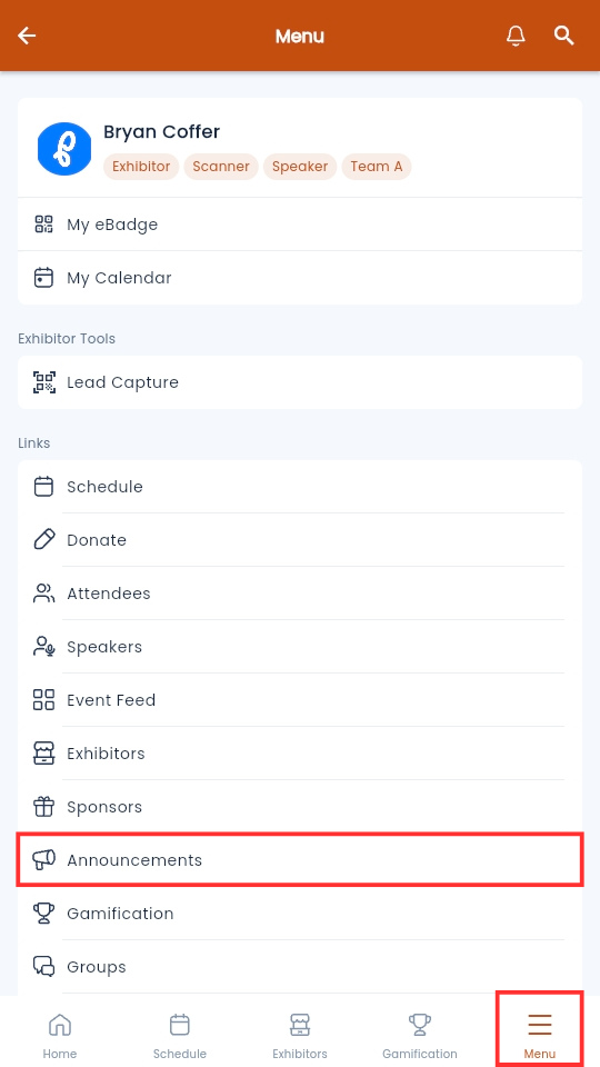 Alternatively, you can navigate to the Announcements page to view all the announcements. Please note that only announcements with the Visible and Show in Event App checkboxes toggled on will appear on this page.