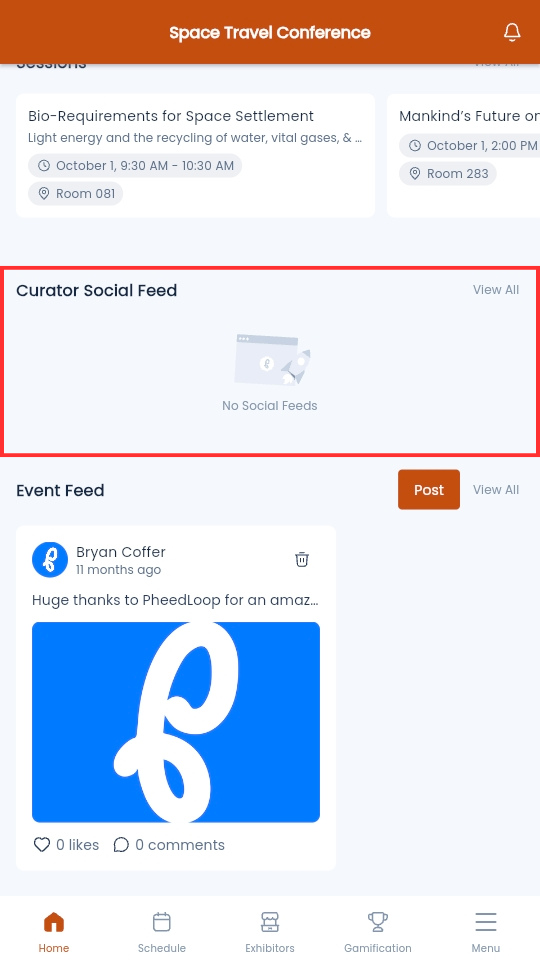 All posts from your designated social media platform will appear here. For more information, please review our Integrating the Curator Social Media Feed into the Event App or Virtual Portal article.