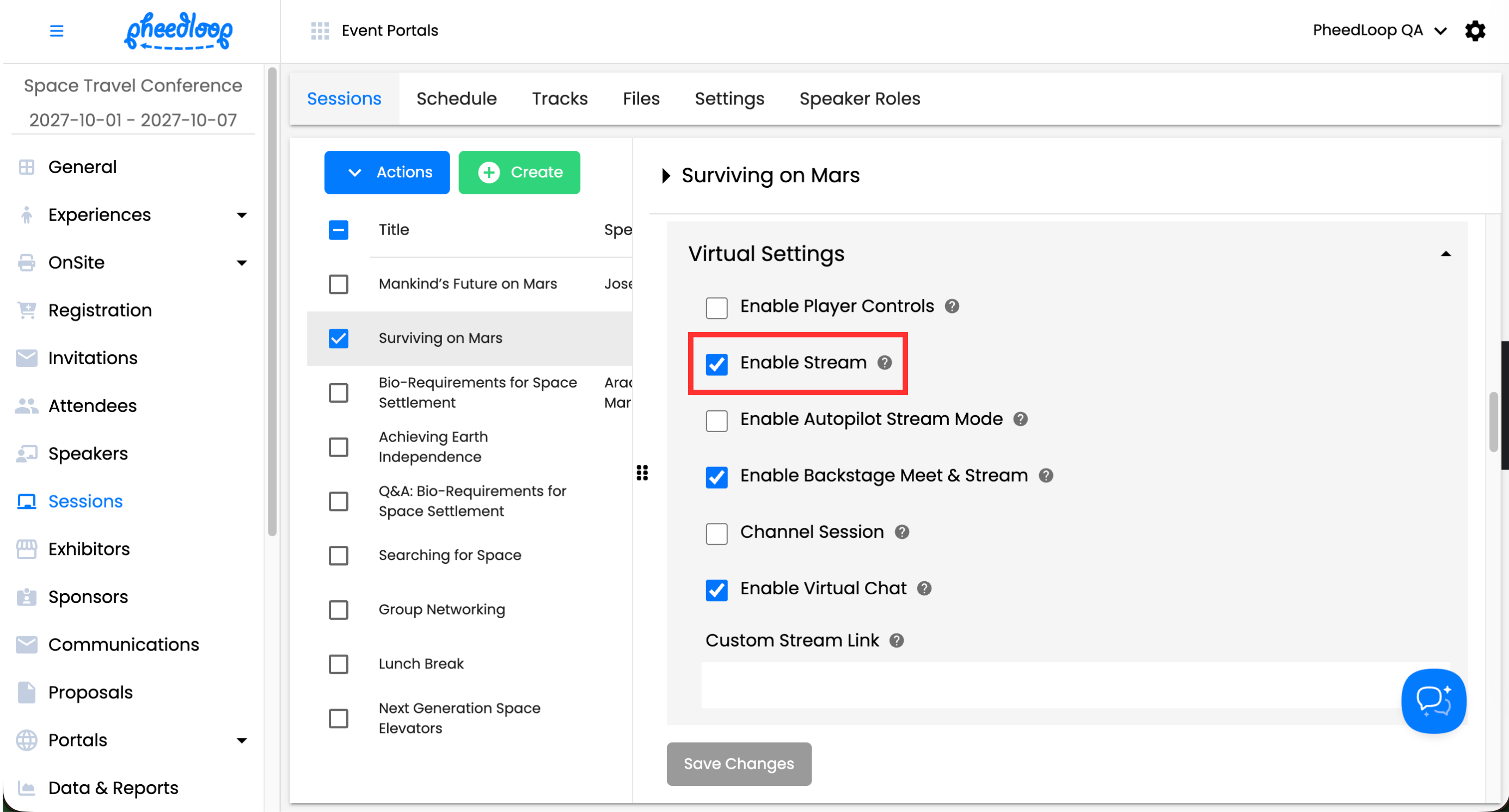 Once the Enable Stream checkbox is toggled on, any video uploaded into Pre-Recorded Video will play in the session’s virtual portal. Please note the video will appear regardless of the session time so only toggle on the Enable Stream checkbox if the session is ready to go live.