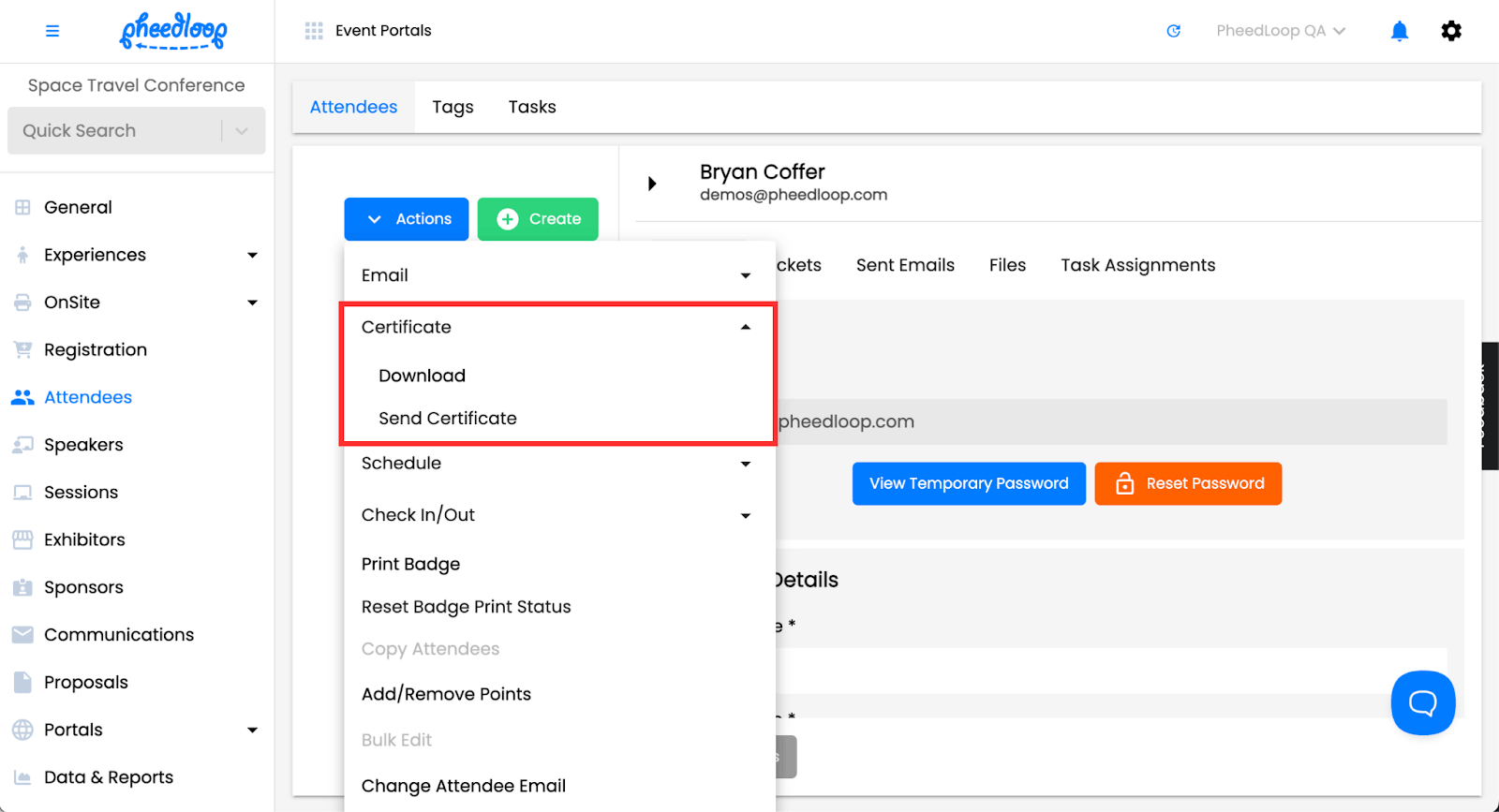 - You also have the option to select Send Certificate. This will immediately send the PDF certificate to the attendee’s email address linked to their profile.