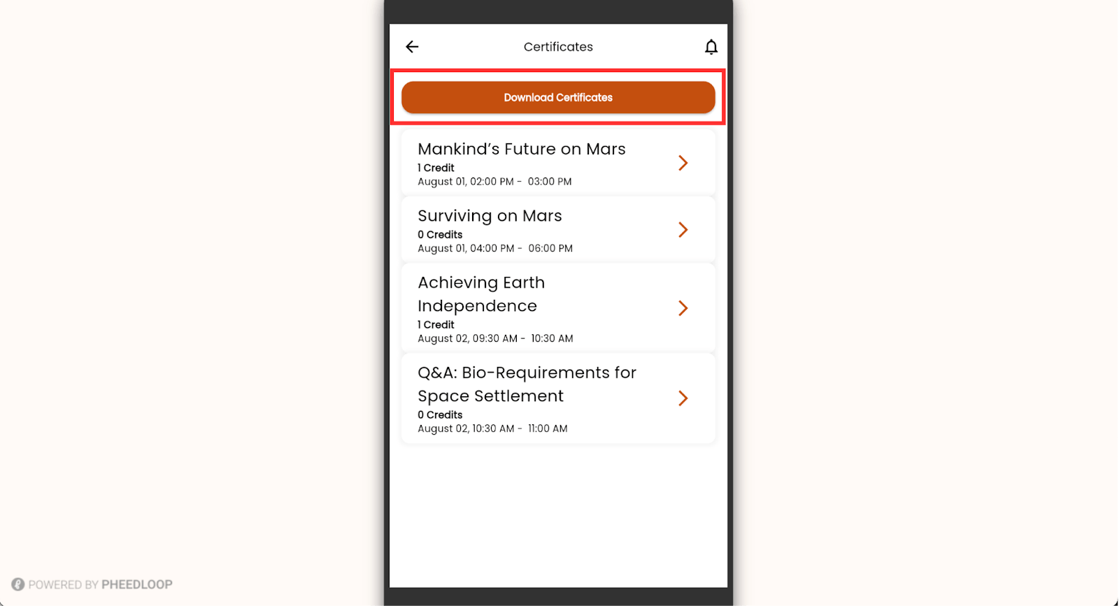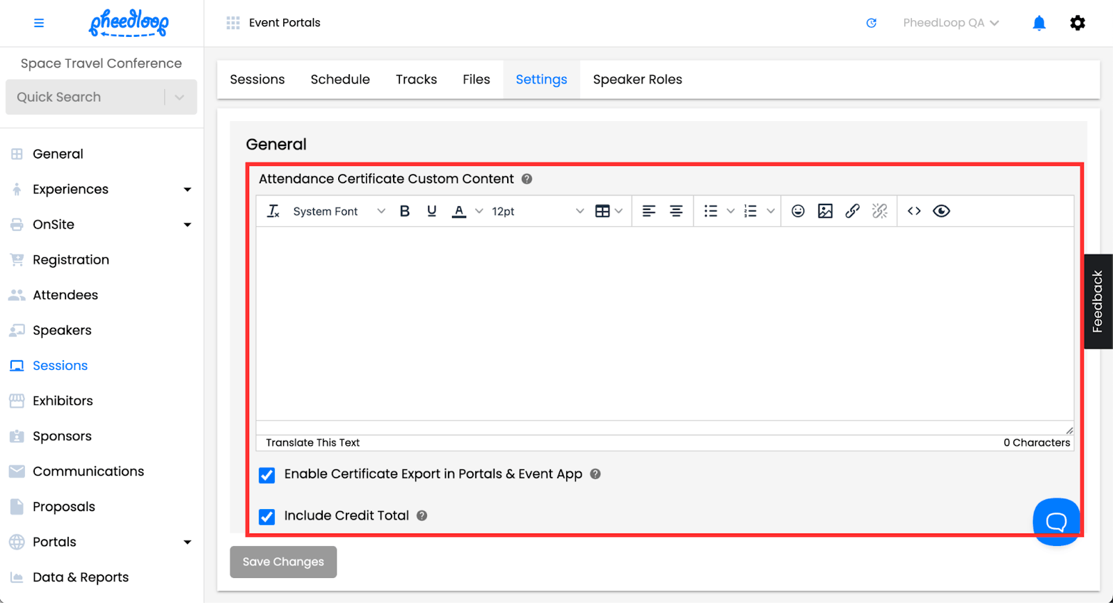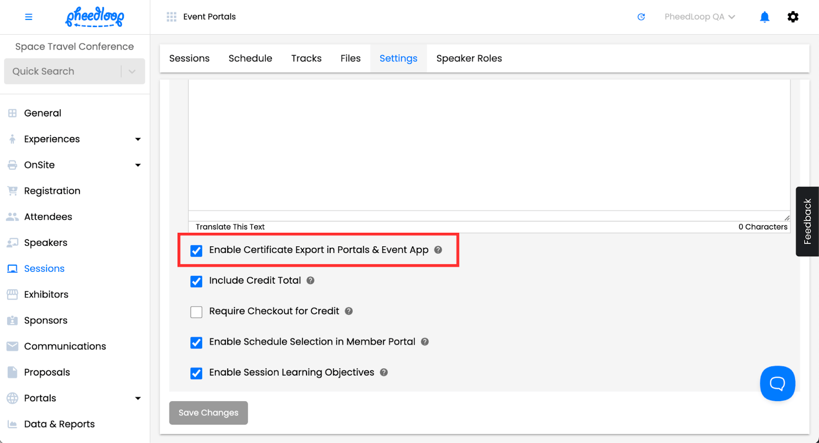 - Toggle on the Enable Certificate Export in Portals & Event App checkbox to allow attendees to download certificates from the Virtual Portal and PheedLoop Go!