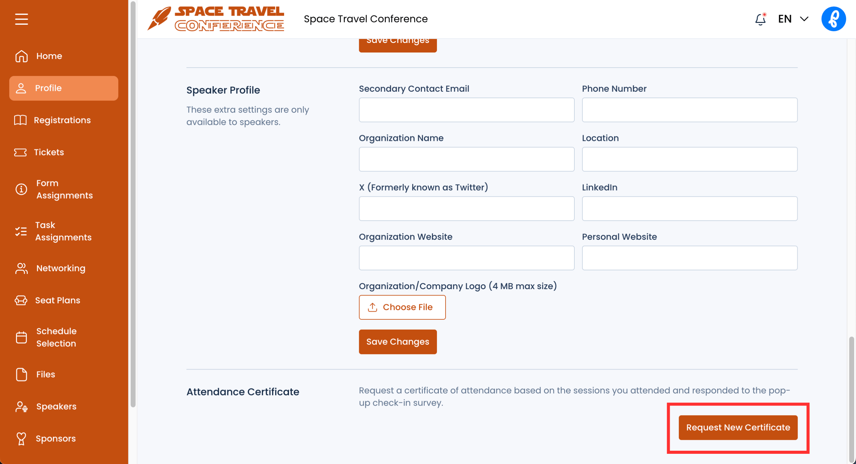 Scroll down to the Attendance Certificate section and select Request New Certificate