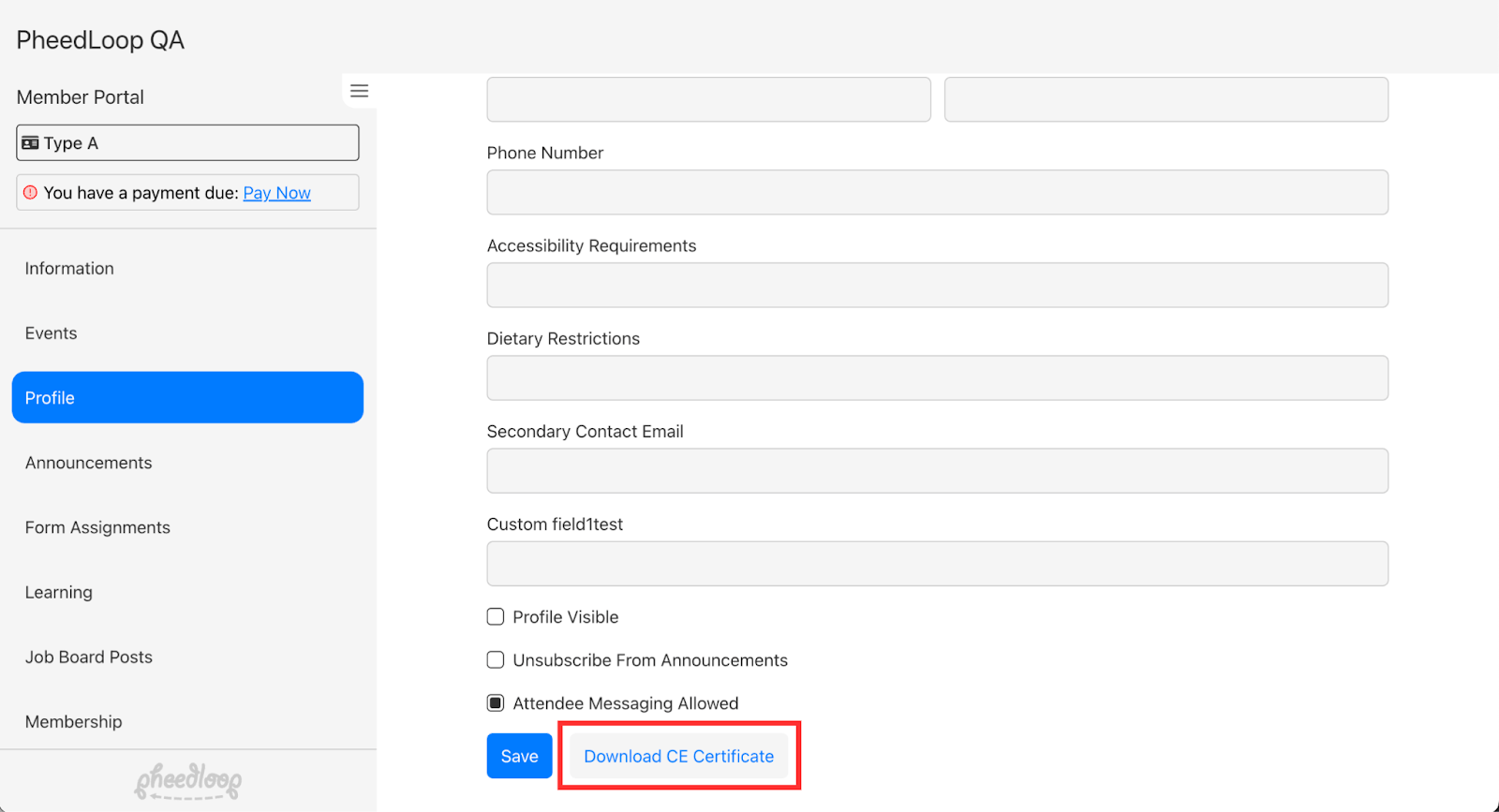 Please note that certificates from the Member Portal display the total CE credits earned across all events attended in PheedLoop. In contrast, other certificate options only generate a certificate for the specific event selected.