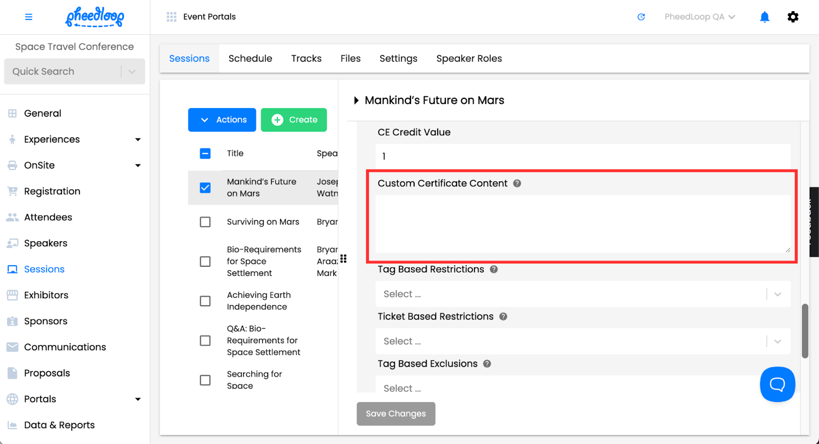 If you want to add a specific set of text associated to a session in the certificate on a per session basis, you have the option to do so.