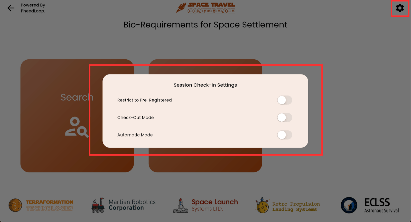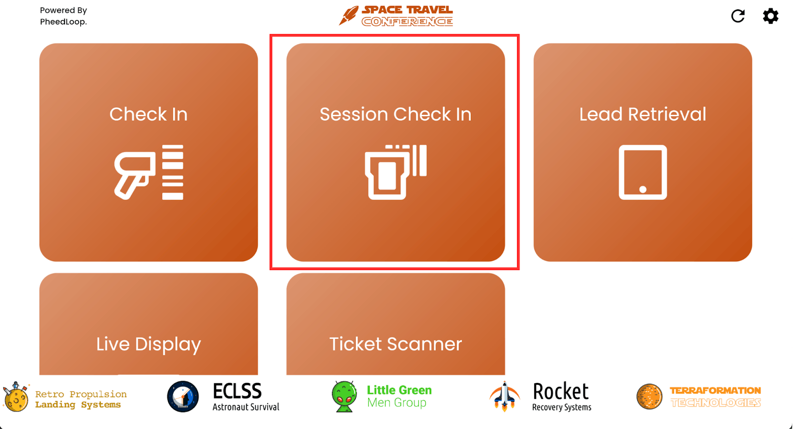 - Session Check-In Settings can be accessed by selecting the Gear Icon on the top right corner