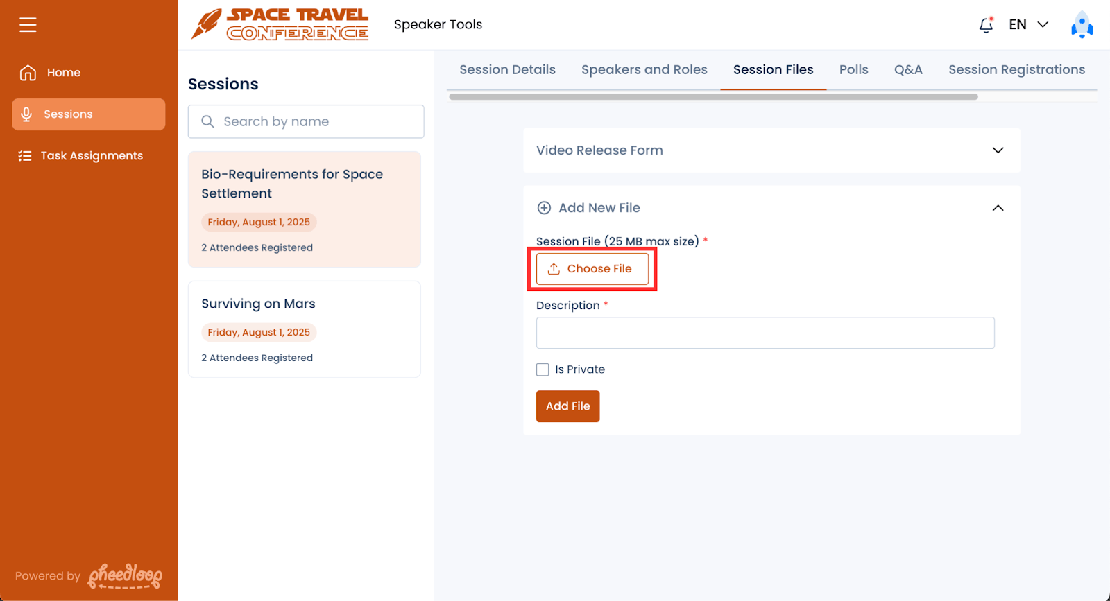- Select the Session you wish to upload files for