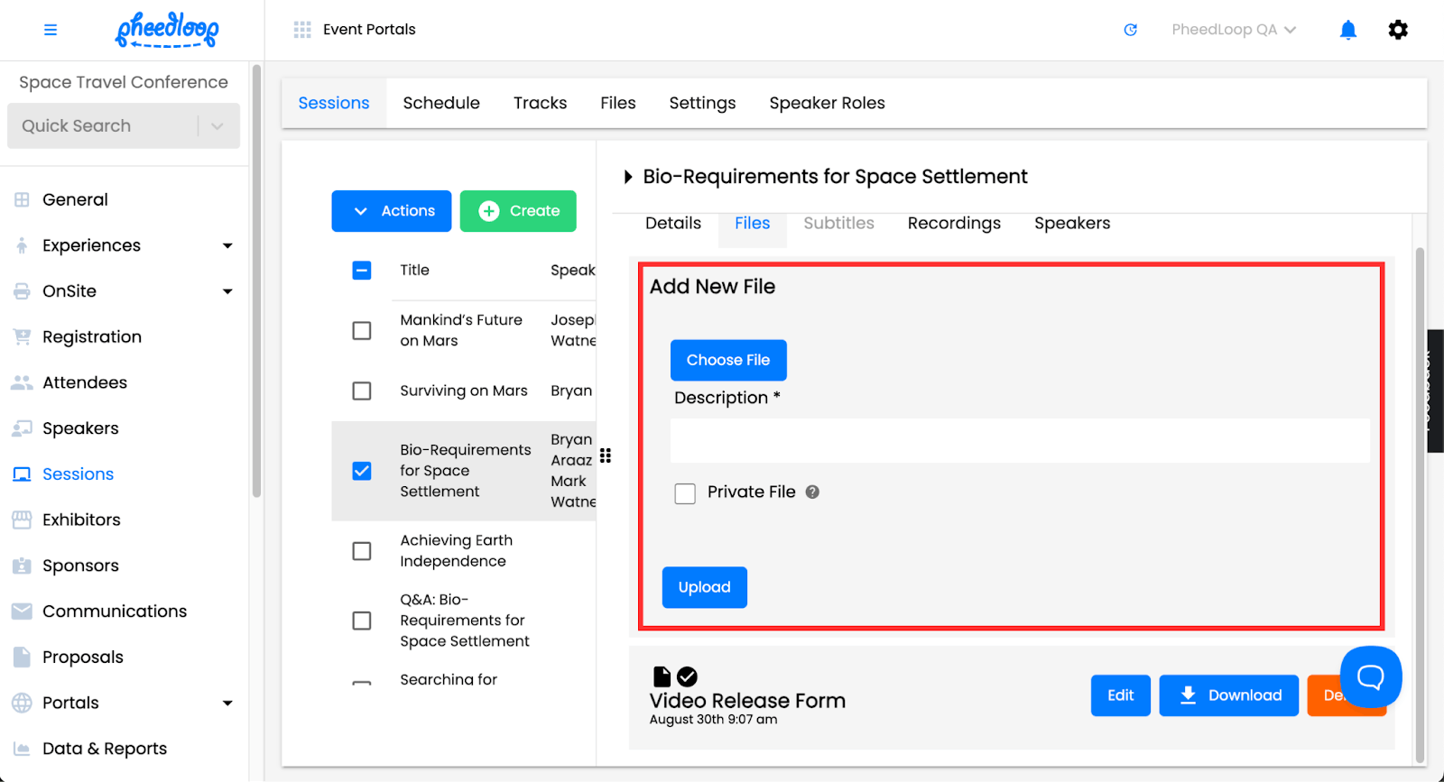 Any files uploaded from the Speaker Portal or Event Dashboard will be visible on the front-end portals unless it is marked as Private.