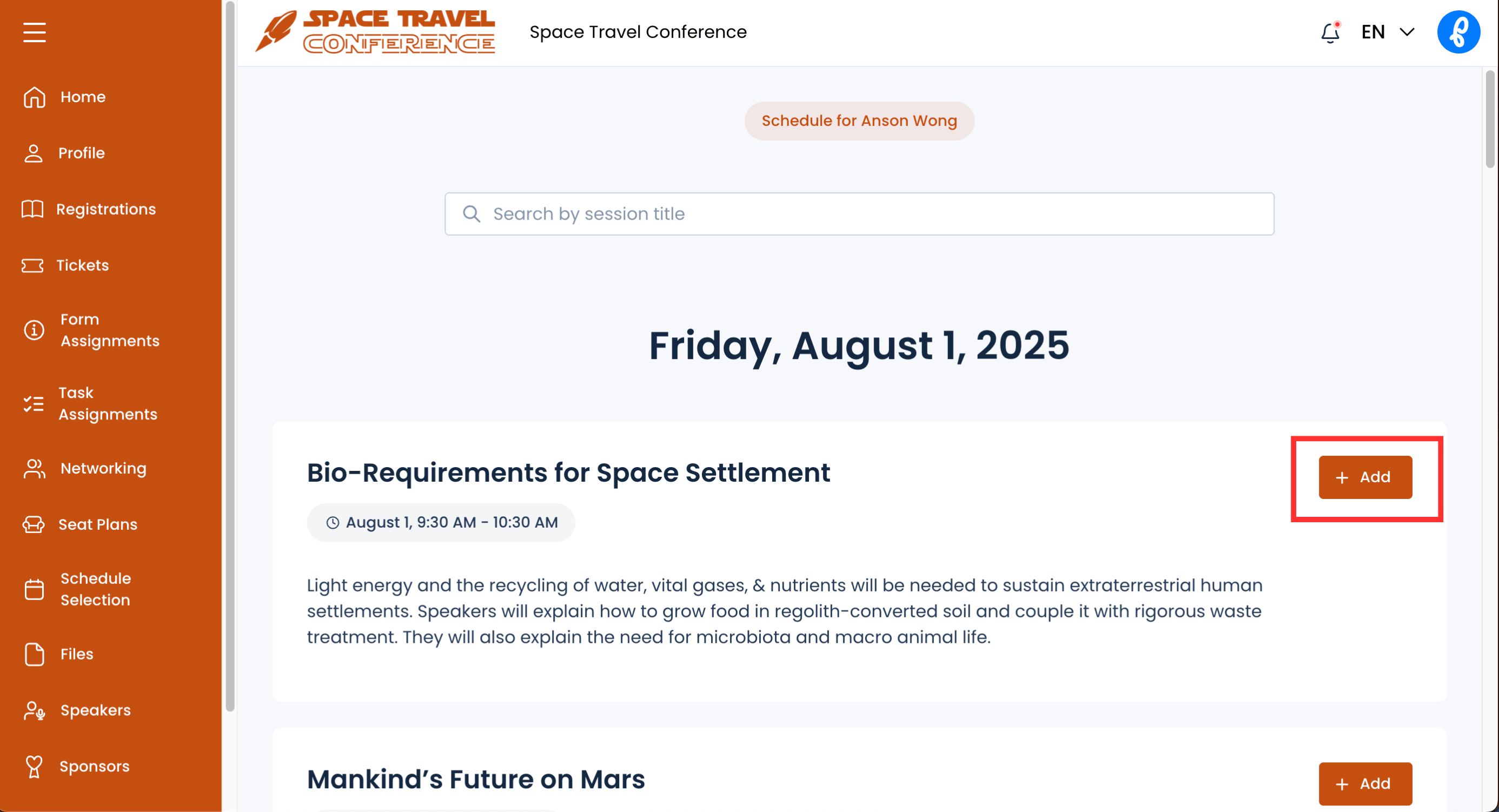 Selecting this option will allow members to select sessions they plan to attend in the Event Portal by selecting Add in the Schedule Selection page.