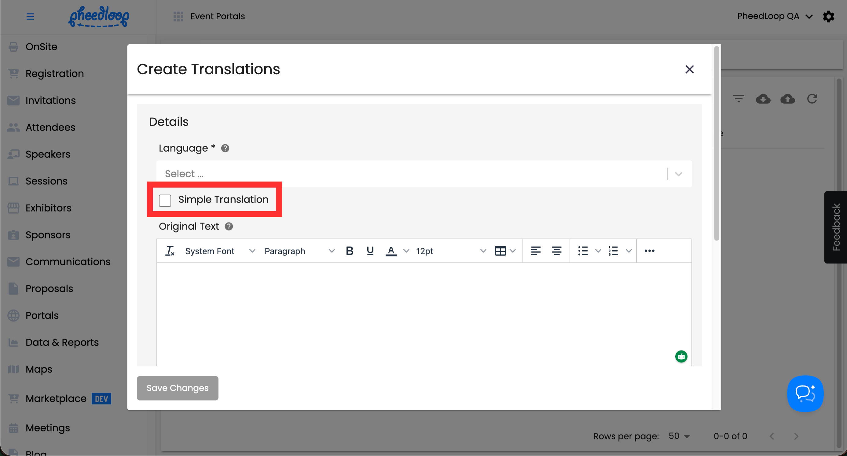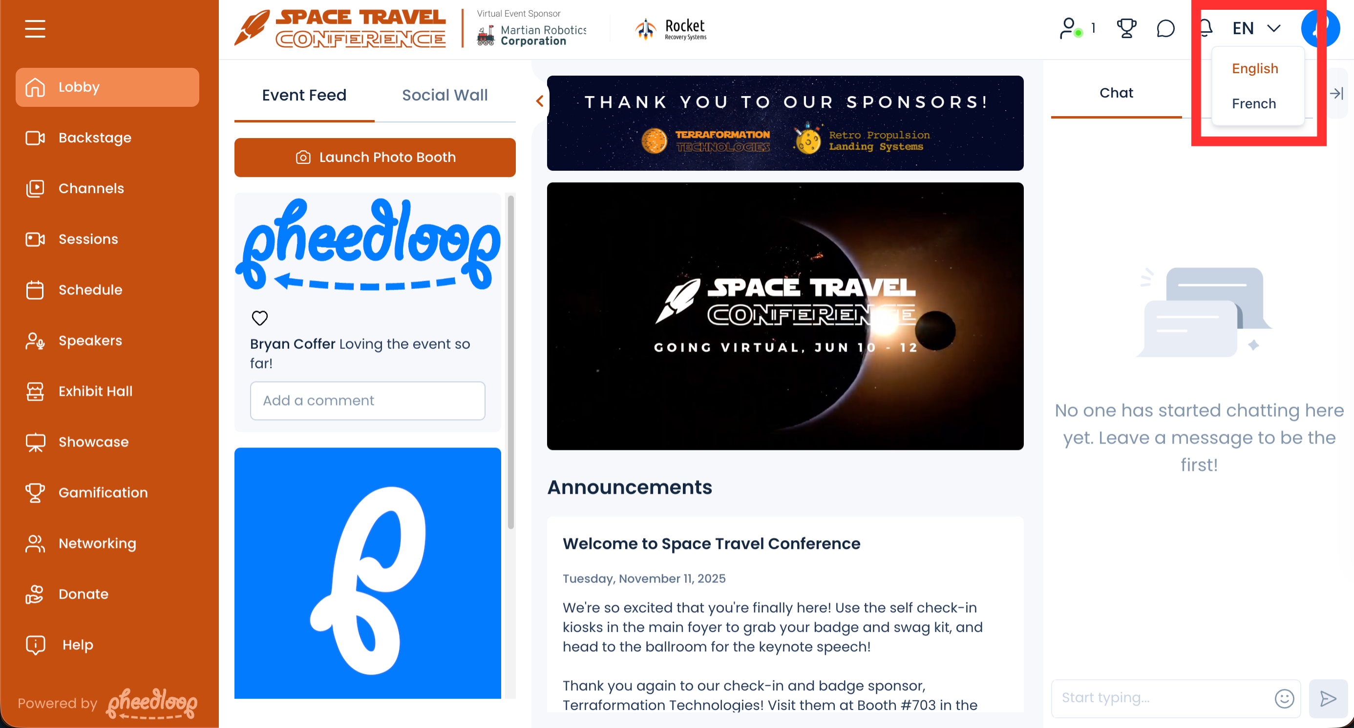 - In many of PheedLoop's external facing portals (Mobile Event App, Virtual Event Portal, and Event Website) we offer multi-language support. You can toggle between different languages. This will translate the whole page and every piece of text into a preferred language.