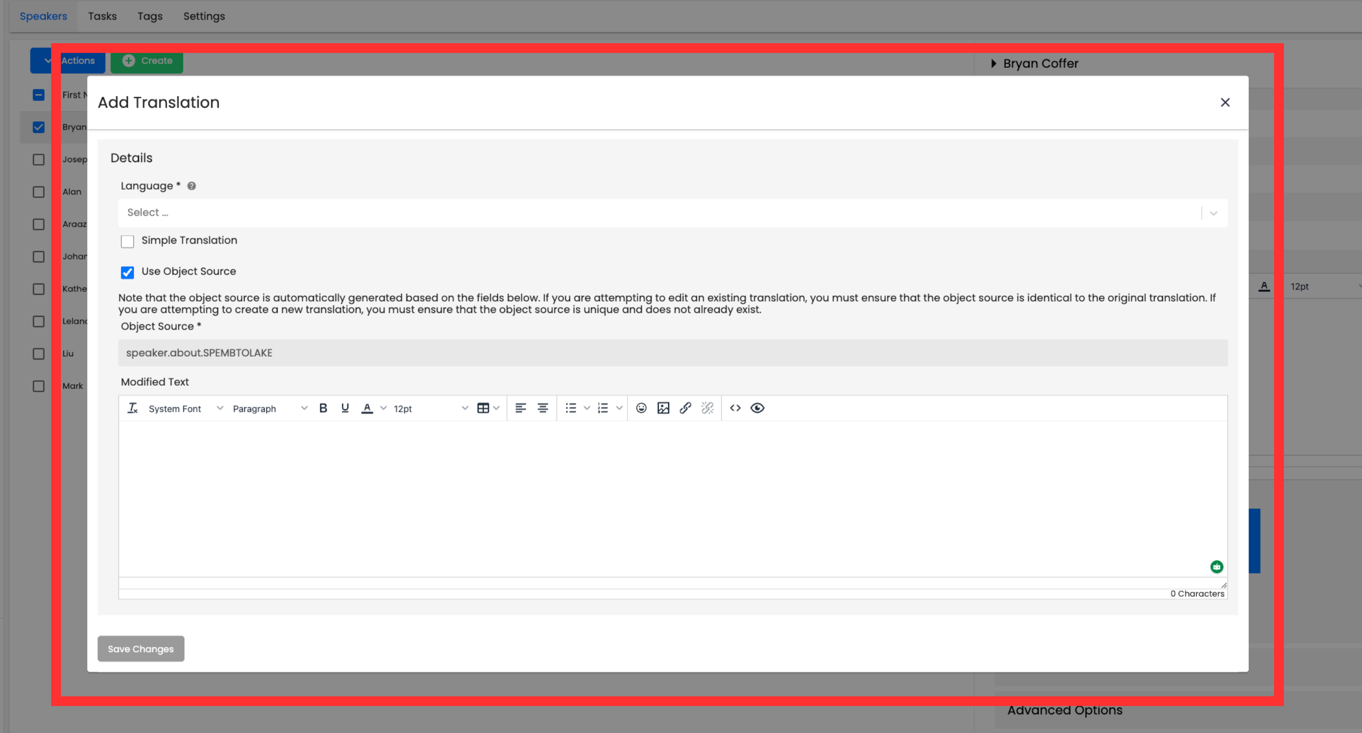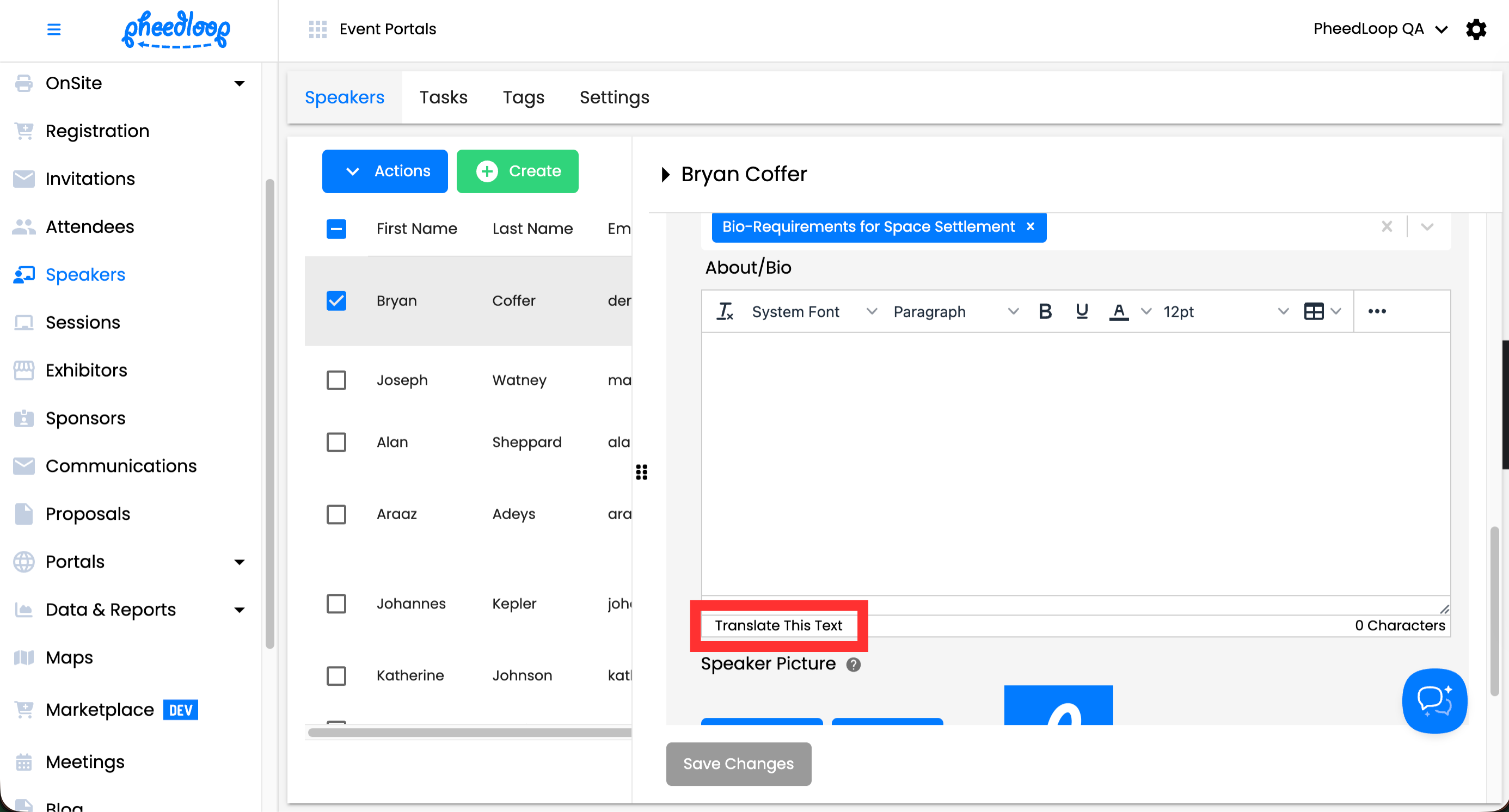 Throughout the Event Dashboard, you may come across the button Translate This Text underneath a box of text. Instead of navigating to Advanced > Translations and manually changing edited text, your alternative is accessing this option whenever it is available. This text can be found in multiple places in your Event Dashboard, but for this example we will use speakers.