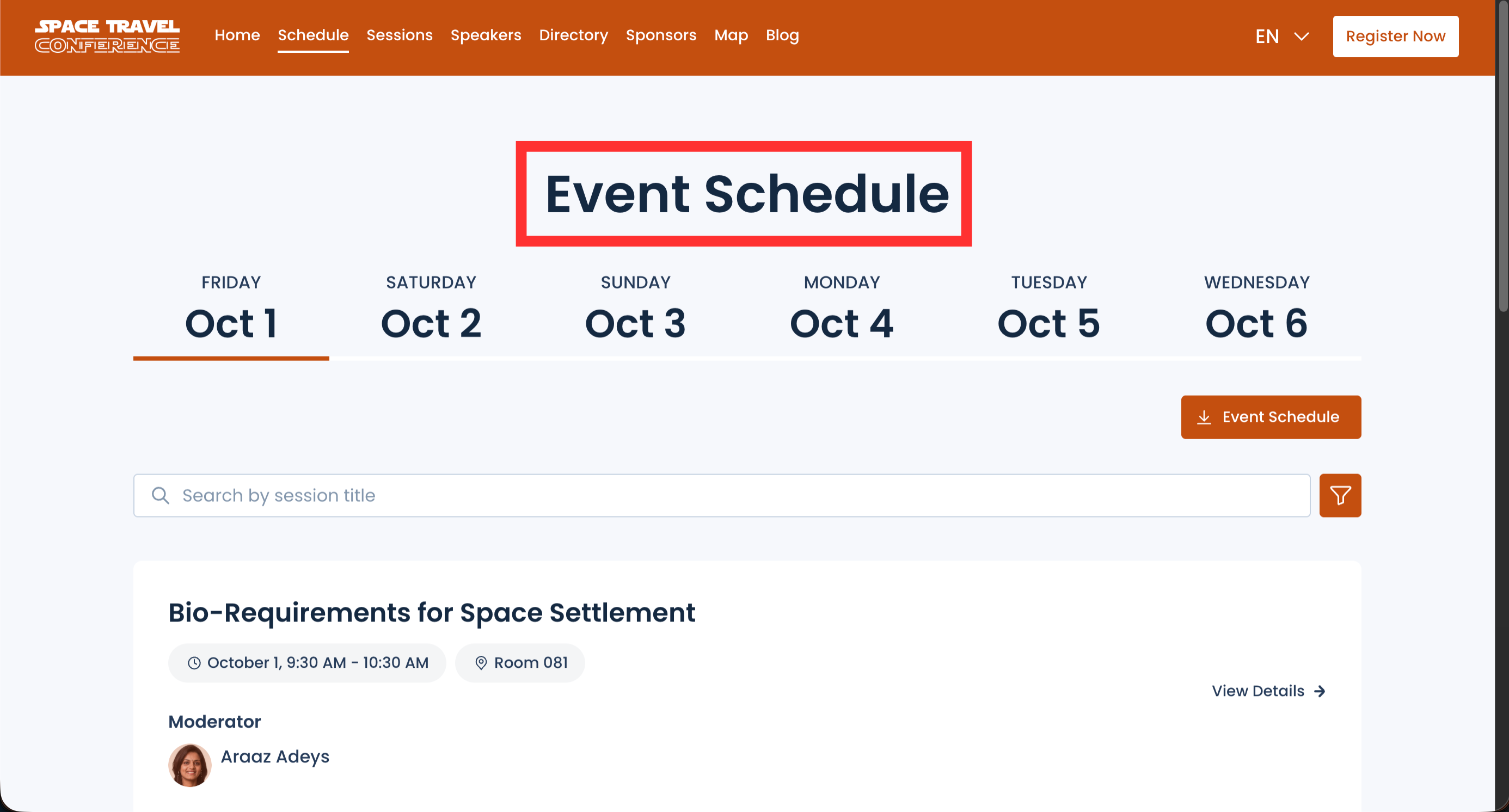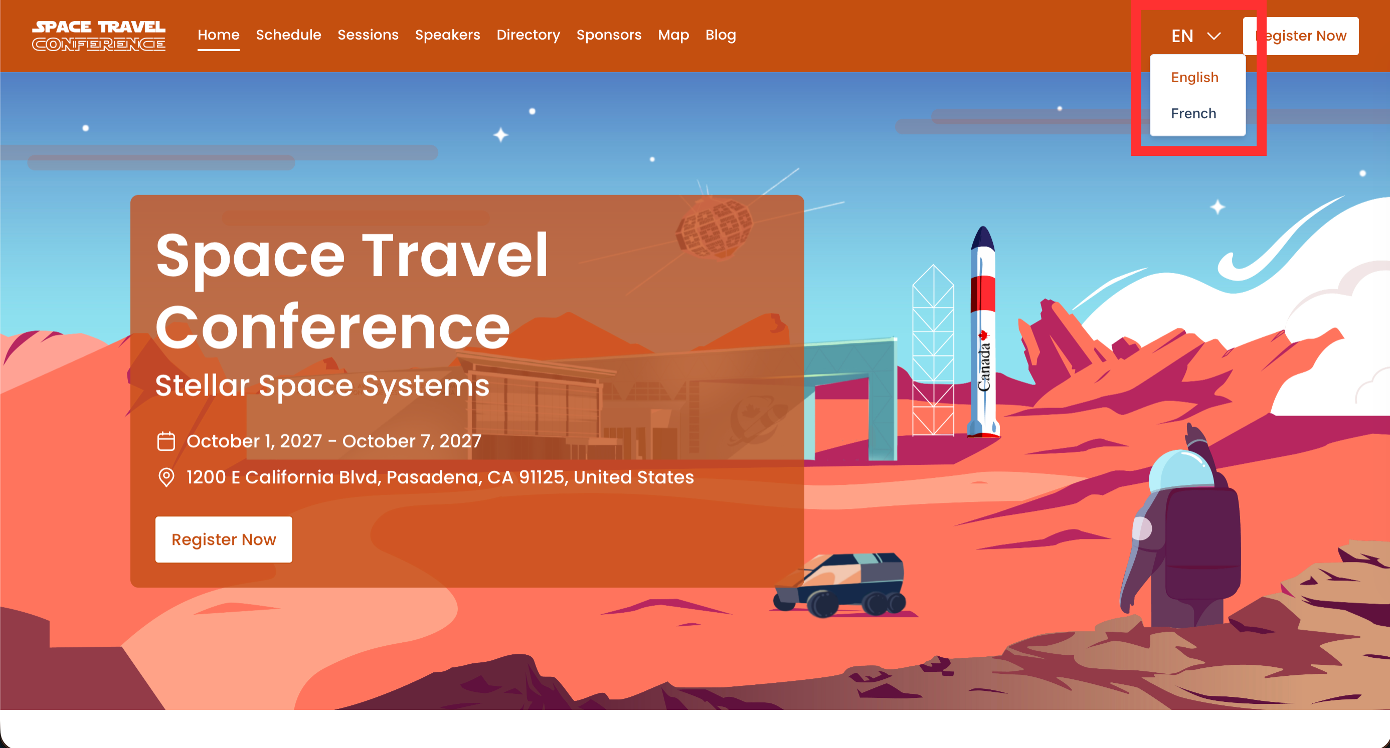 Once you have completed and saved your translations, it’s time to view them. For this example, we will go through the Event Website to show you how to check. We have translated the “Event Schedule” into “Event Program.”