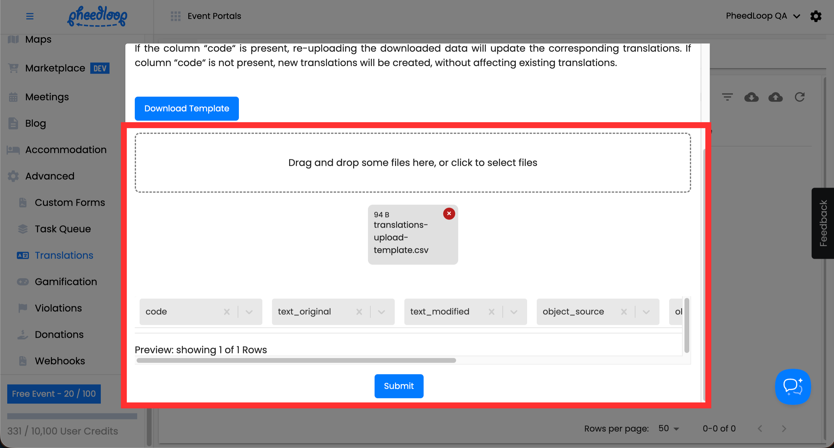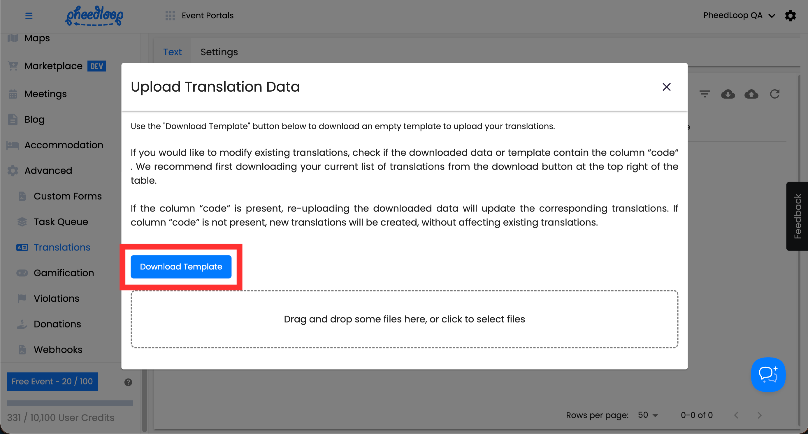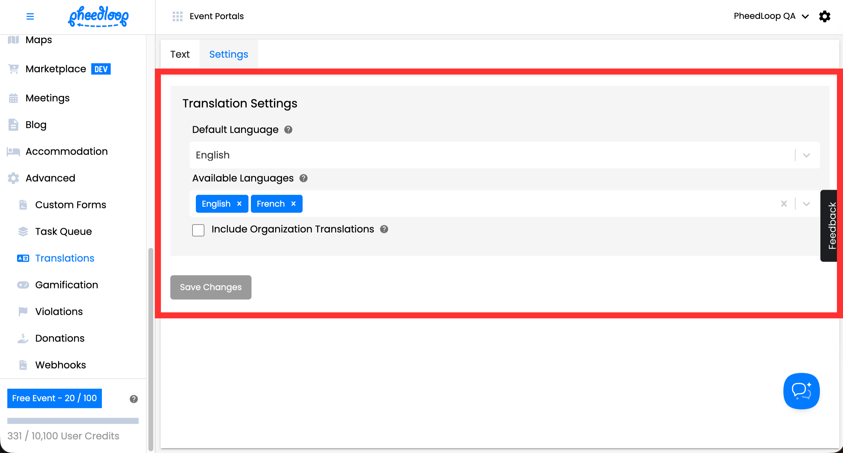 - From the Event Dashboard, navigate to Advanced > Translations > Settings
