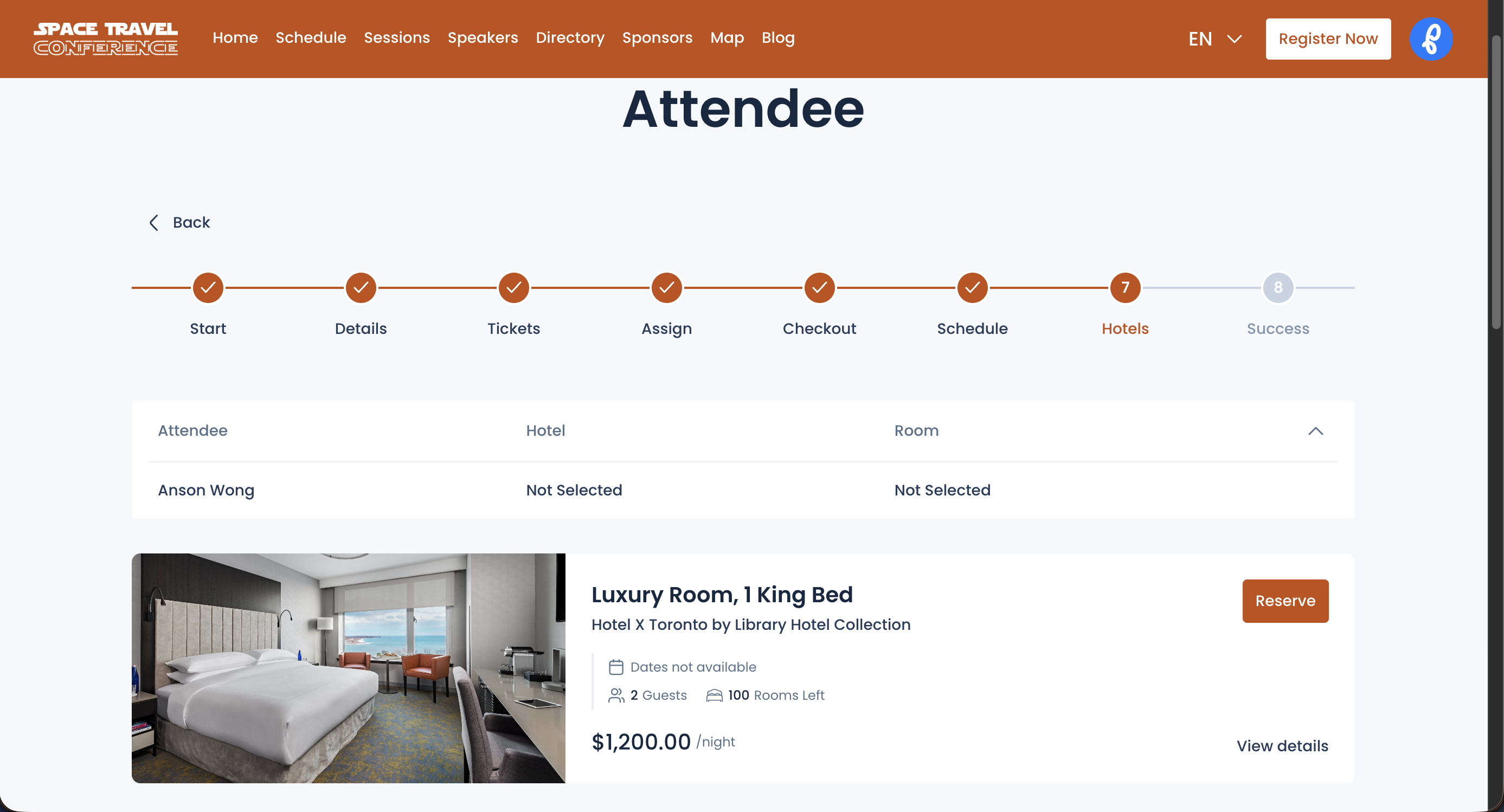As an attendee, the process of acquiring a hotel room for your event is simply going through the registration flow. The Hotel Reservation step will appear after the checkout, schedule, and seat selection steps (if configured).
