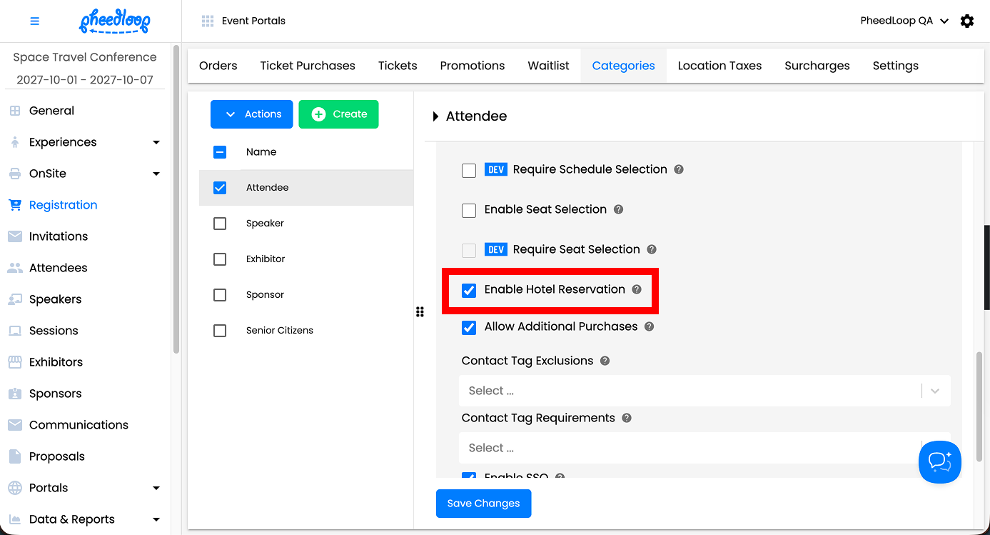 Event administrators must first toggle on the Enable Hotel Reservation checkbox in the category settings before attendees can select their hotel