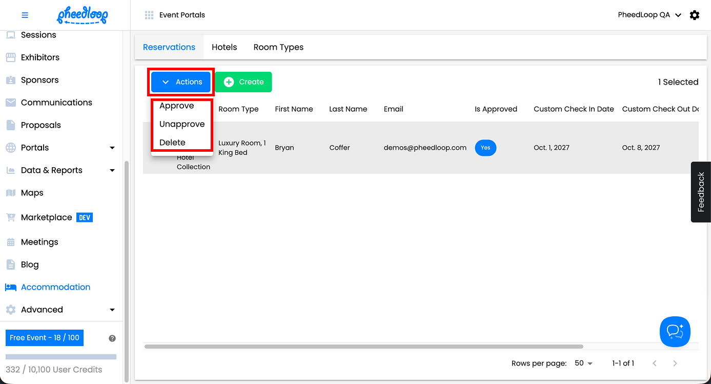 Once an attendee reserves a hotel room, it’s up to the event administrator to approve/unapprove the reservation from the Event Dashboard. By approving hotel submissions, event administrators can better manage their room inventory.
