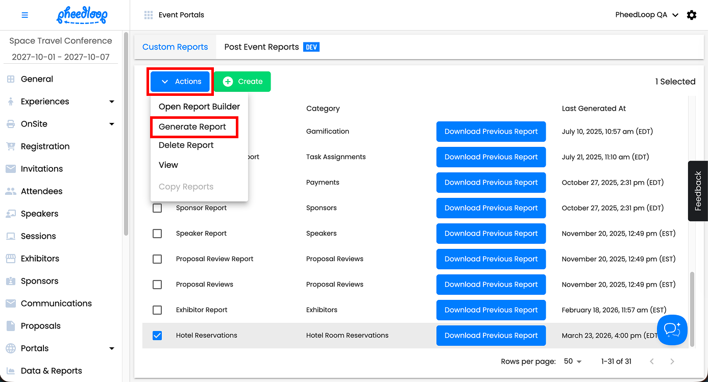 Above the custom report table, select Actions > Generate Report