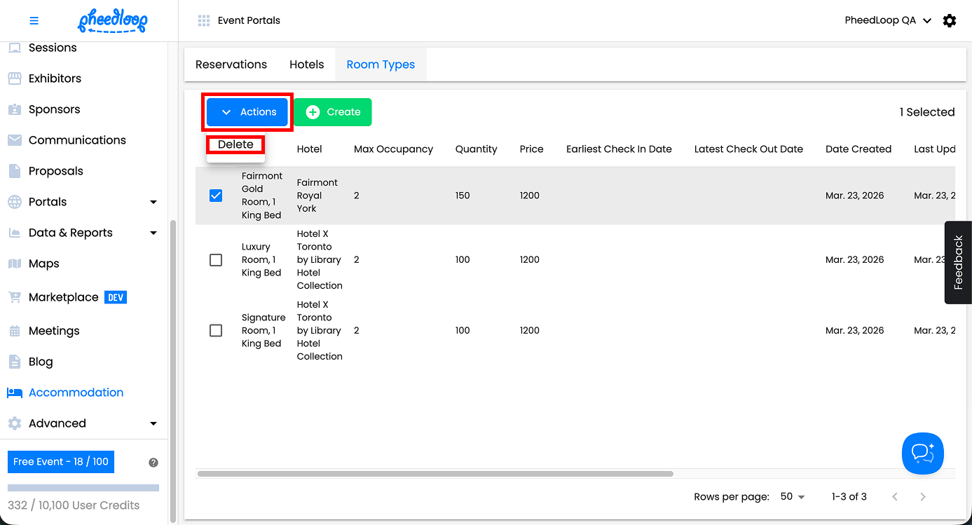 Note - to delete any rooms, navigate to Accommodation > Room Types, select the room you would like to delete from the list and select Actions > Delete.