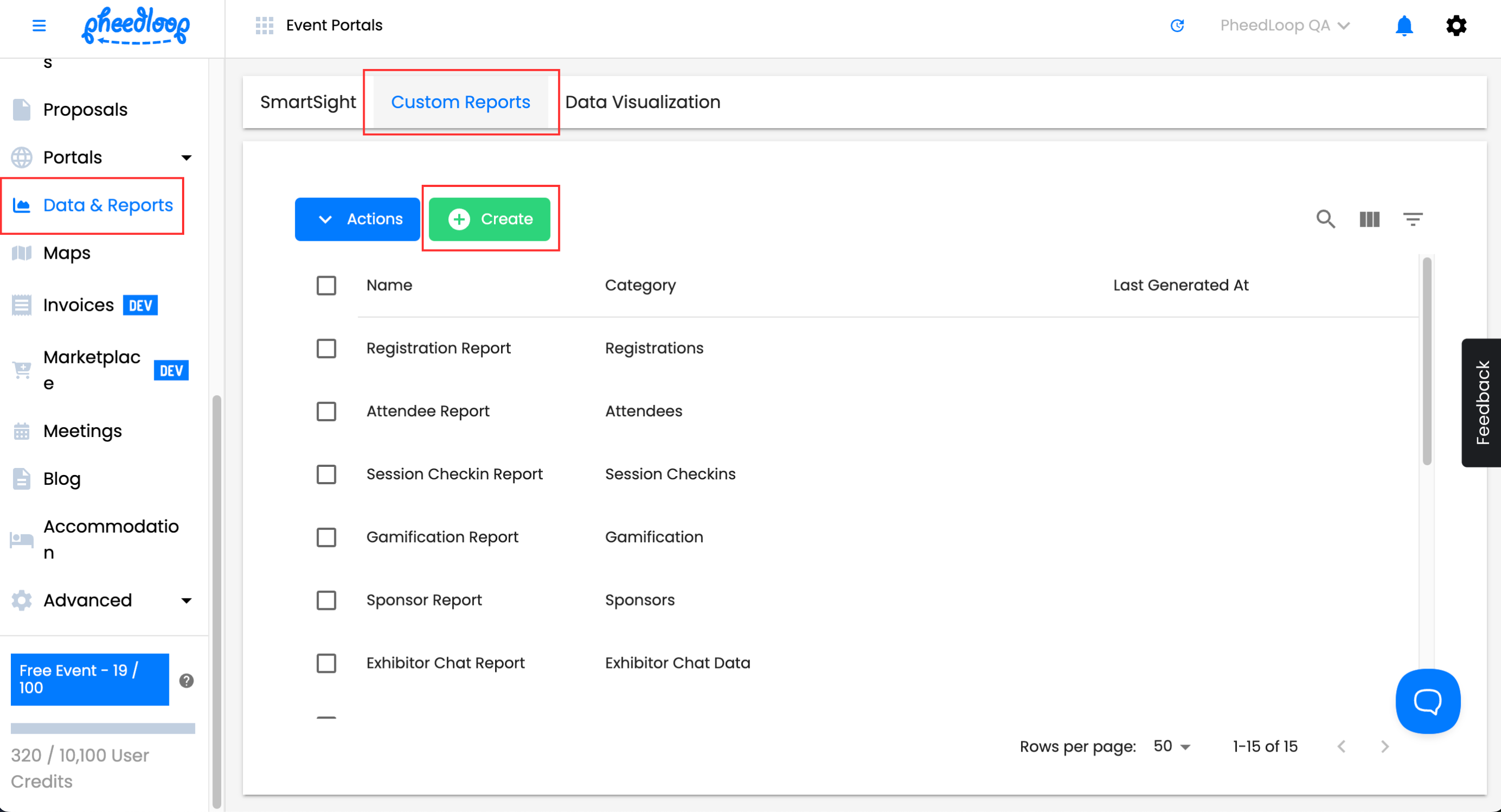 From the Event Dashboard, navigate to Data & Reports > Custom Reports and above the custom reports table, select Create