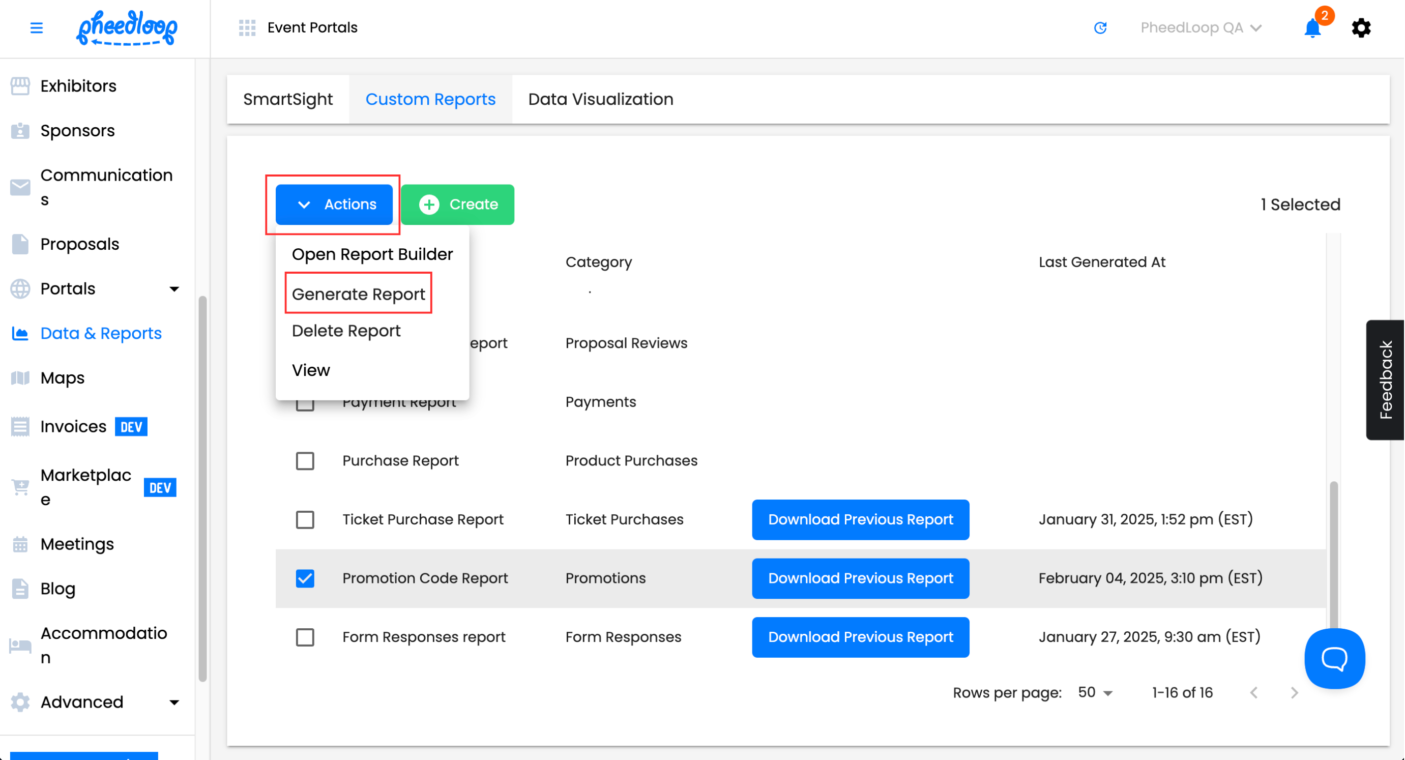 Above the custom reports table, select Actions > Generate Report