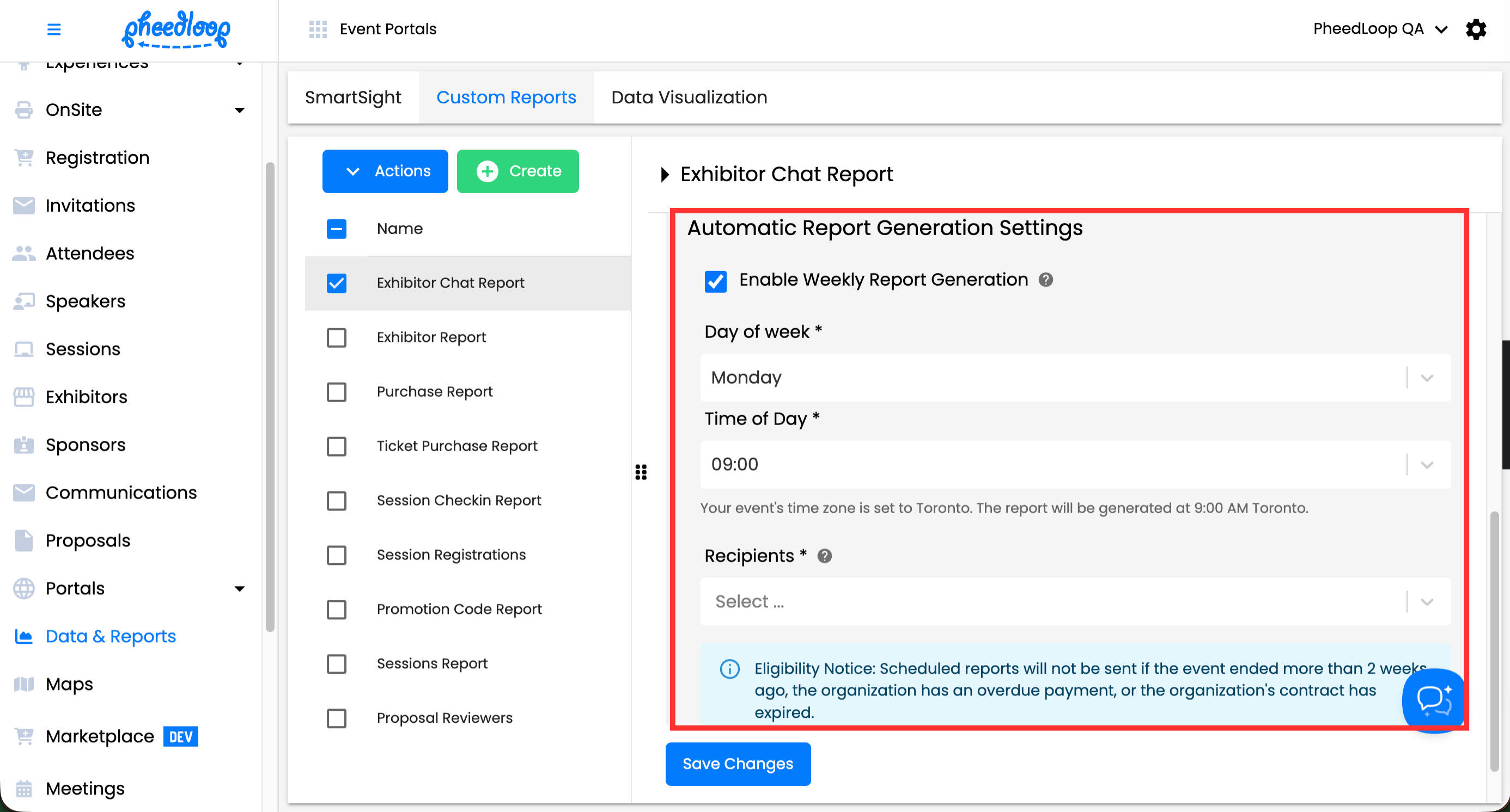 Administrators can now configure custom reports to automatically send via email on a recurring schedule. This feature enables automated delivery of important event data without requiring manual report generation and distribution.
